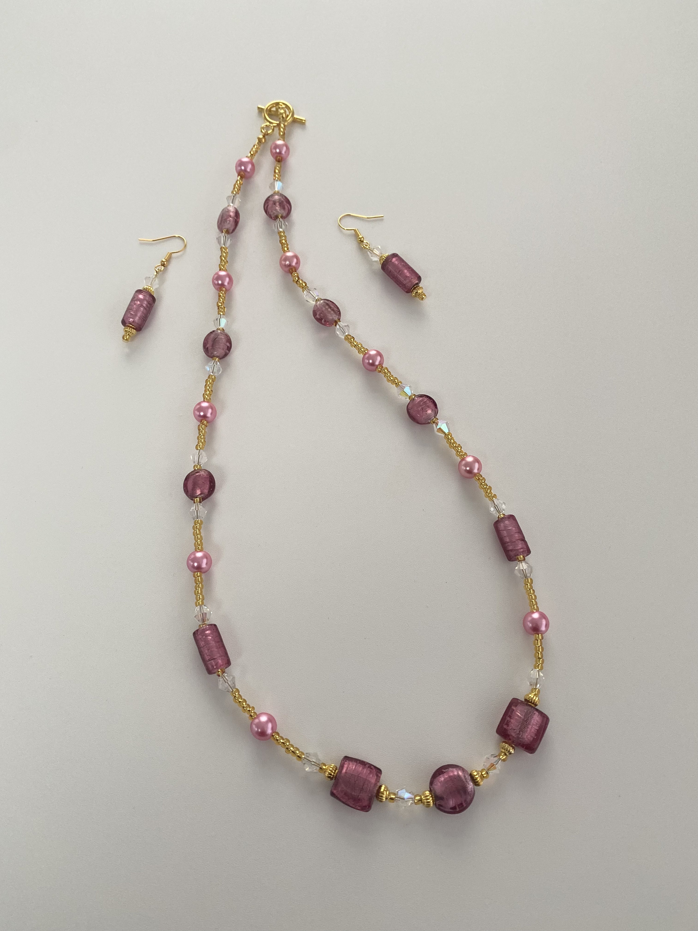The necklace has been made with pink glass beads in a mixture of different shapes, pink pearly beads, crystal glass beads, gold plated spacer beads and gold seed beads.