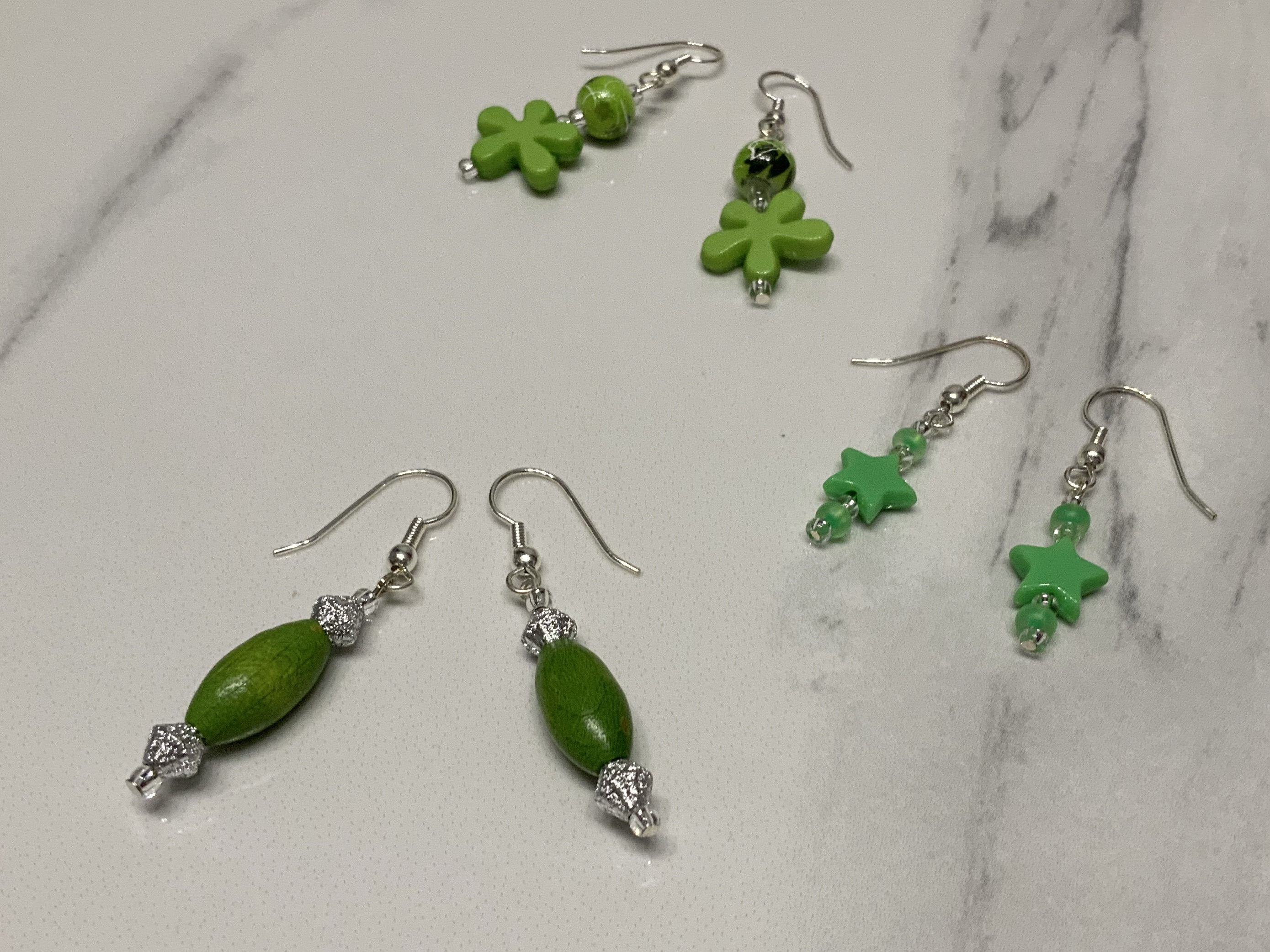 A set of 3 pairs of green coloured earrings All finished with silver plated earring hooks.